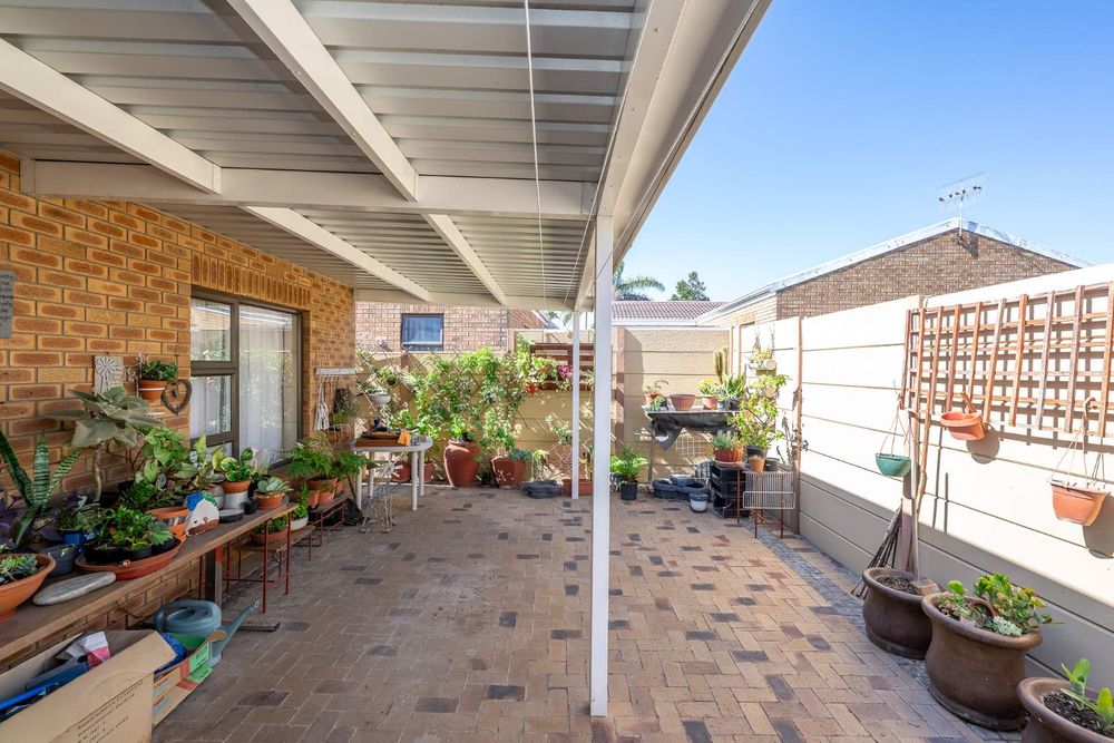 The double garage offers direct access to the house with two manual roll-up doors, a water point for a washing machine, space for extra shelving or a chest freezer, and a prepaid electricity meter. Outside, enjoy covered patios that can be easily enclosed to create a braai room or left open for relaxed outdoor living. A wellpoint and Wendy house provide additional storage solutions.