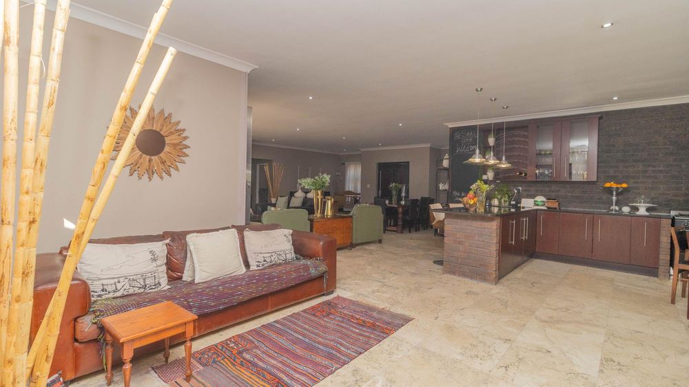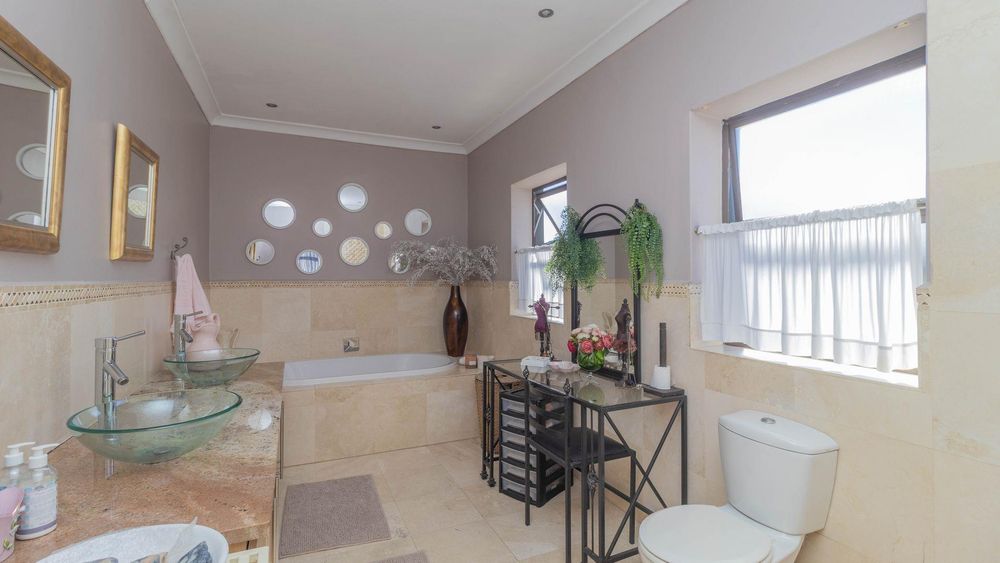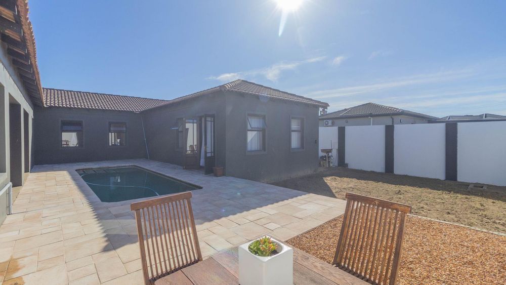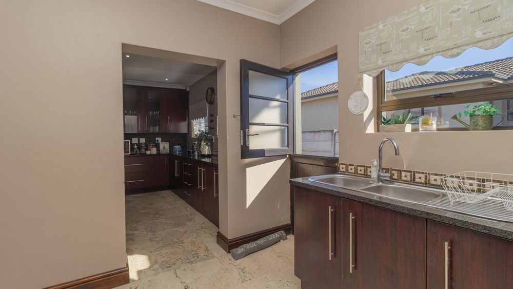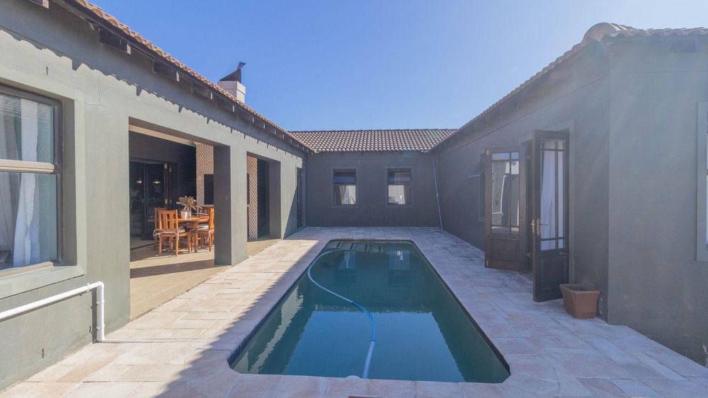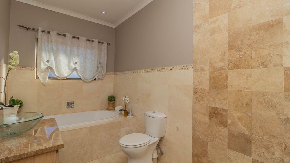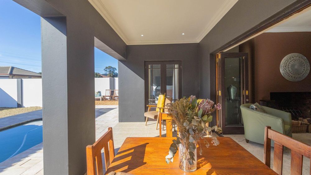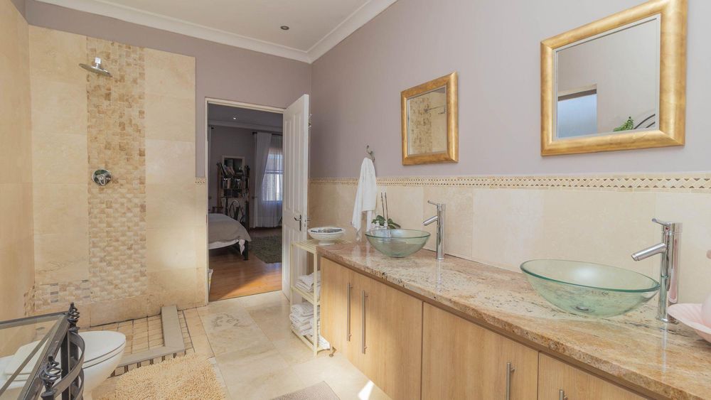 Your guests will appreciate the comfort and privacy of the guest suite, which offers direct access to the patio braai area and pool. The main bedroom serves as a peaceful retreat, featuring direct pool access and a luxurious en suite bathroom complete with his and hers basins, ensuring a serene start to your day.